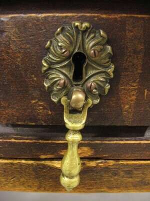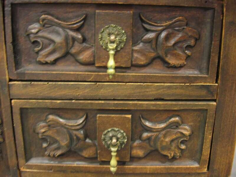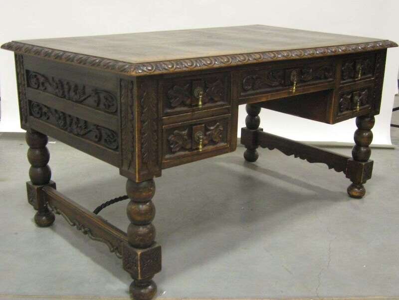 carved molded top over central long drawers flanked by two drawers on either side resting on turned legs and carved stretchers with iron supports.