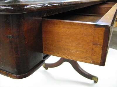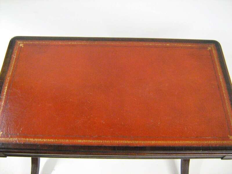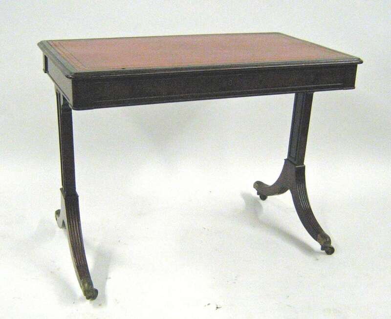 The rectangular red leather inset top above one long drawer raised on square supports and splayed reeded legs ending in brass caps and casters.