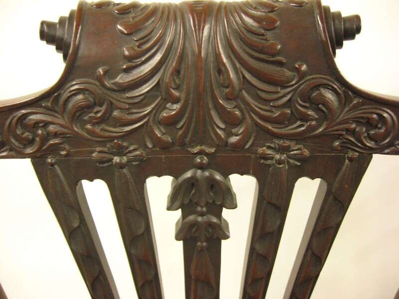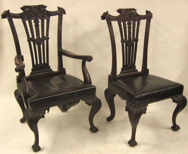 Comprising two armchairs, six side chairs in the George II taste, with a leaf carved pierced back and scrolled handholds, the leather seat raised on curved legs ending in ball and claw feet. (8).