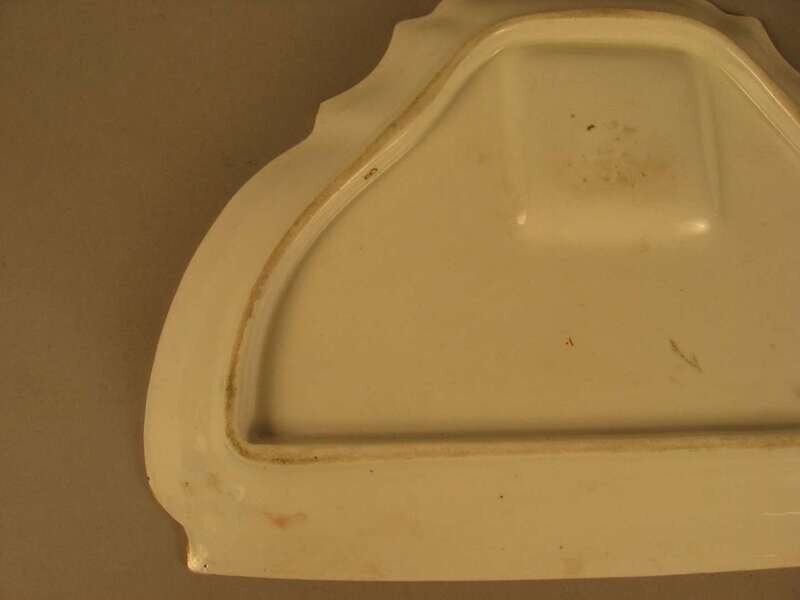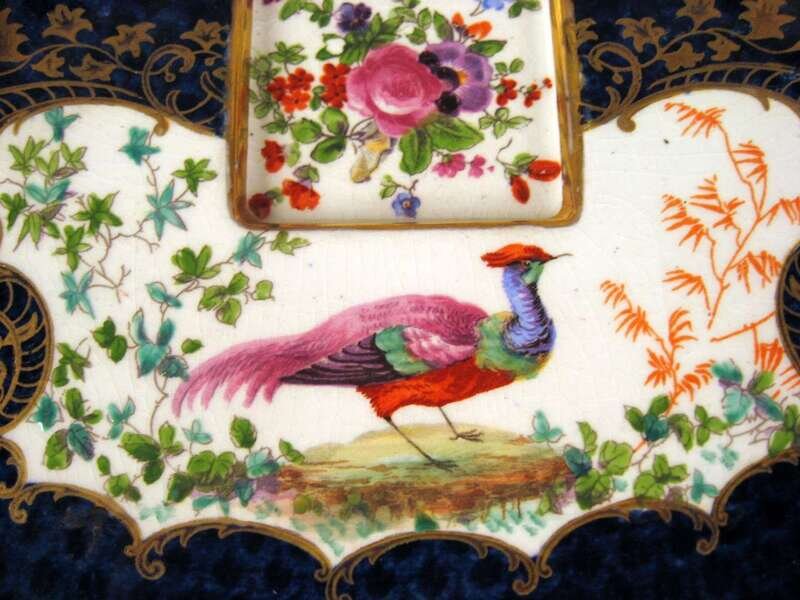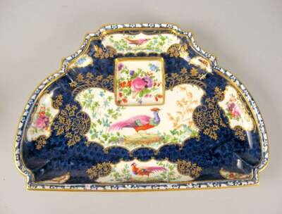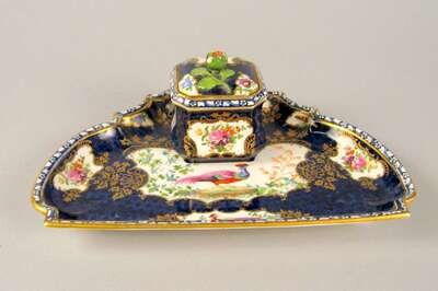 The shaped demilune tray decorated with reserves of exotic birds, insects and floral bouquets, with a canted square inkpot with flower bud finial.