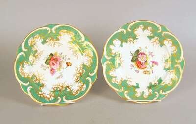 With a scalloped rim decorated with c-scrolls and gilt on a green ground centered by floral sprays on a white ground, printed purples marks. (2).