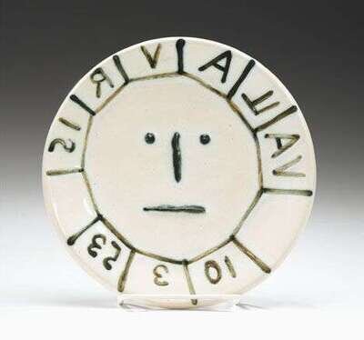 1953, edition of 400, stamped 'EMPREINTE ORIGINALE DE PICASSO,' and 'MADOURA PLEIN FEU,' on underside, ceramic plate, painted and partially glazed