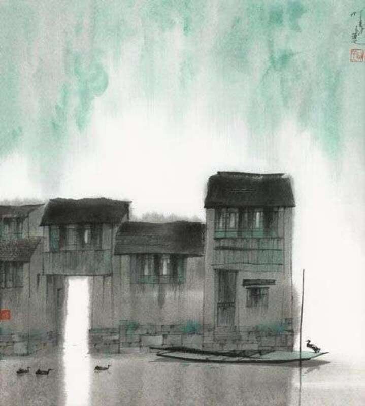 YANG MINGYI (CHINESE B. 1943) BUILDINGS ON A RIVER WITH SAMPAN AND DUCKS