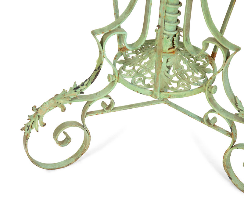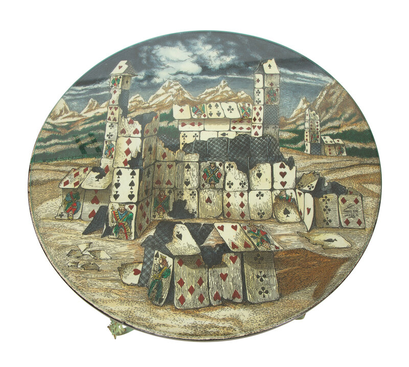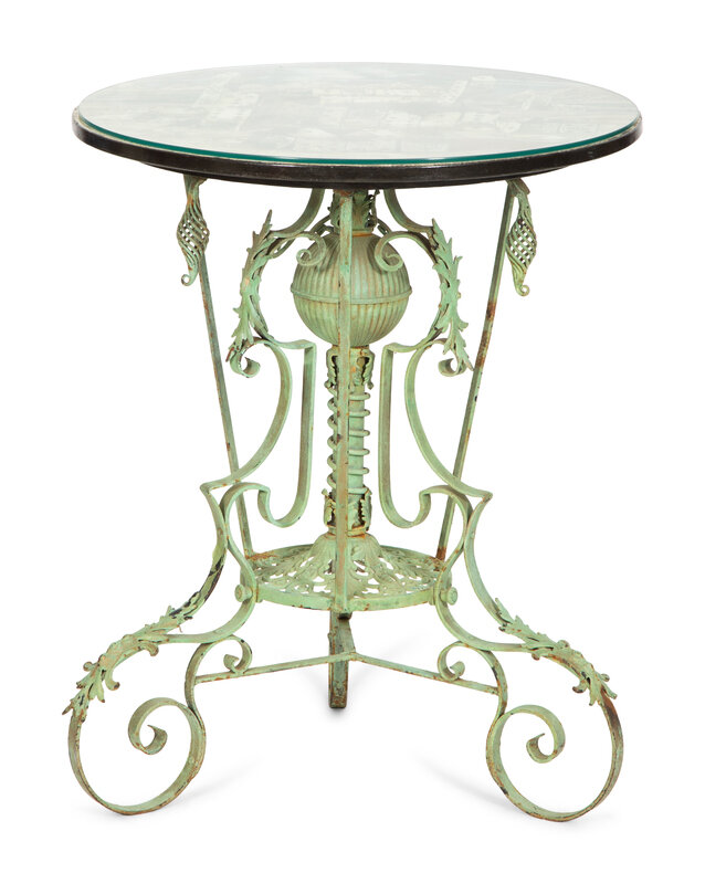 A Fornasetti Citta di Carte Table Top on Painted Wrought Iron Base