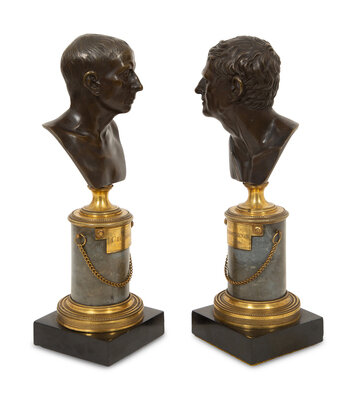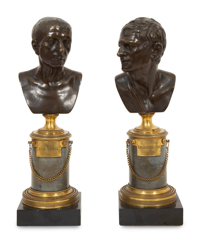 the pair of Cicero and Demosthenes, raised on gilt bronze mounted marble socles, and Caracalla on a red marble socle.