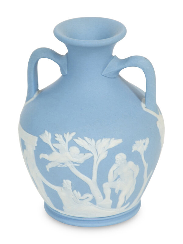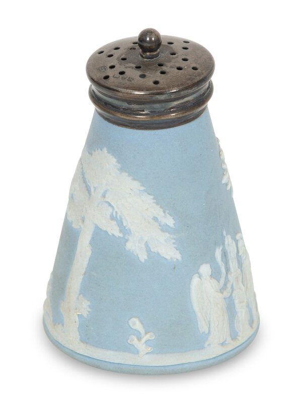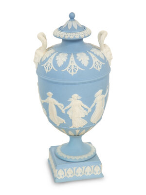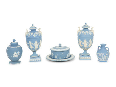 comprising a pair of lidded urns, a smaller lidded urn, a lidded circular box on undertray, an amphora vase and a salt shaker.