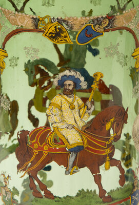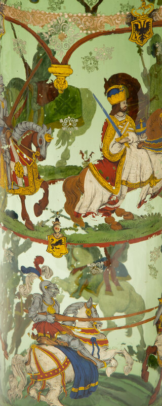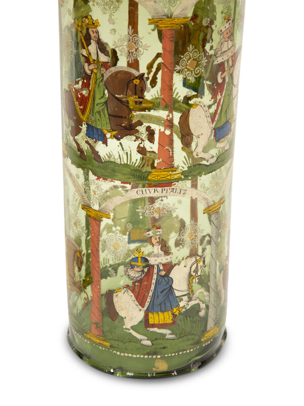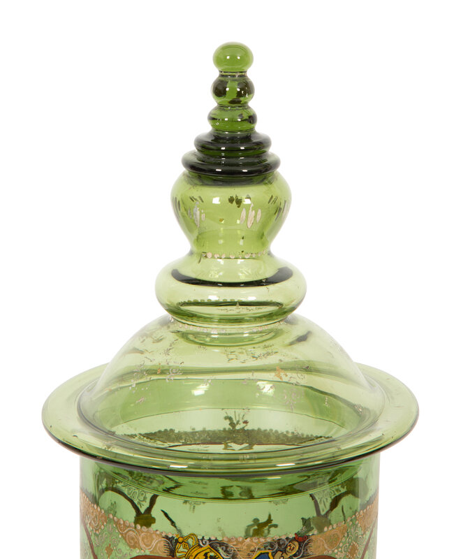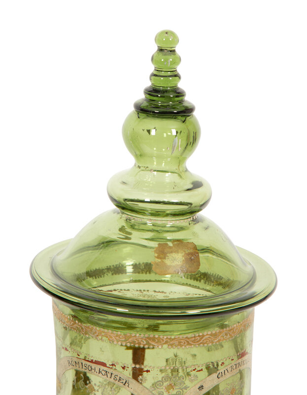 A Near Pair of Bohemian/German Enameled Green Glass Vases and Covers, Humpen