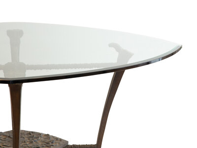 A glass and cast iron base dining table, height 30 1/2 x width 58 x depth 58 inches