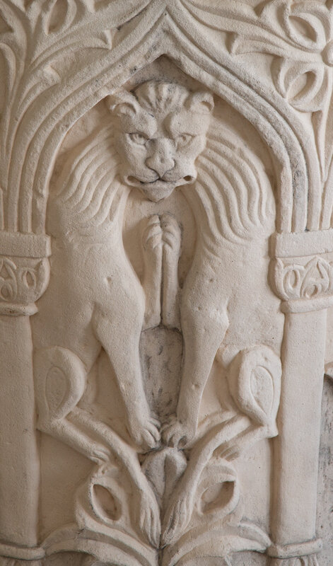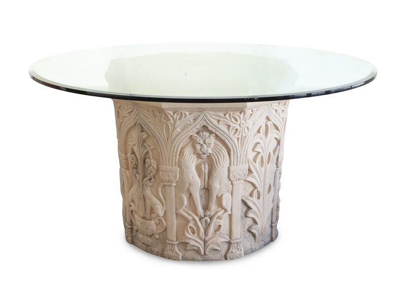 A Carved Stone Pedestal Center Table with Glass Top
