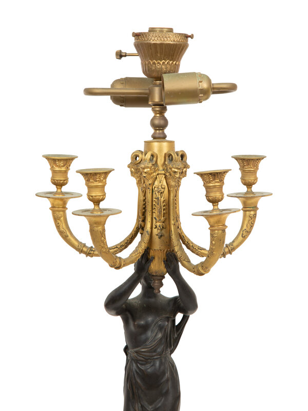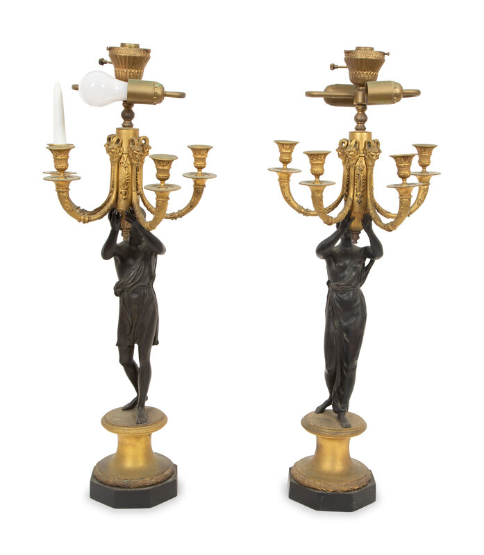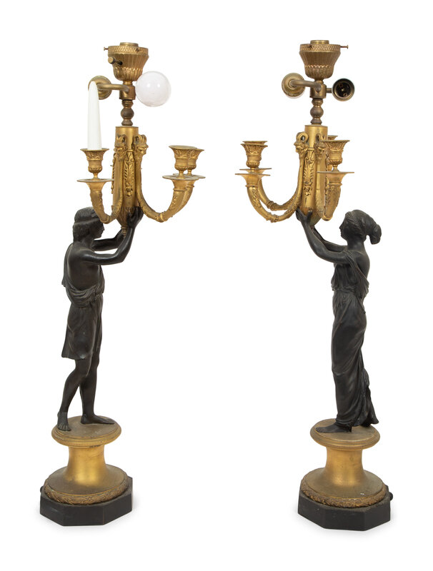 A Pair of Gilt and Patinated Bronze Figural Lamps