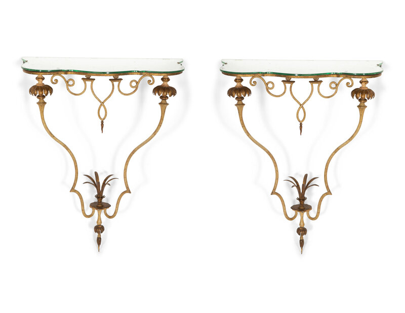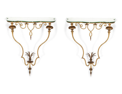 A Pair of Continental Painted and Parcel Gilt Metal, Mirrored Small Console Tables