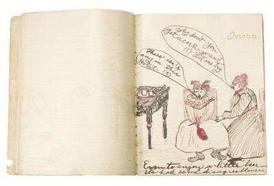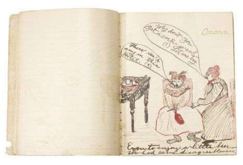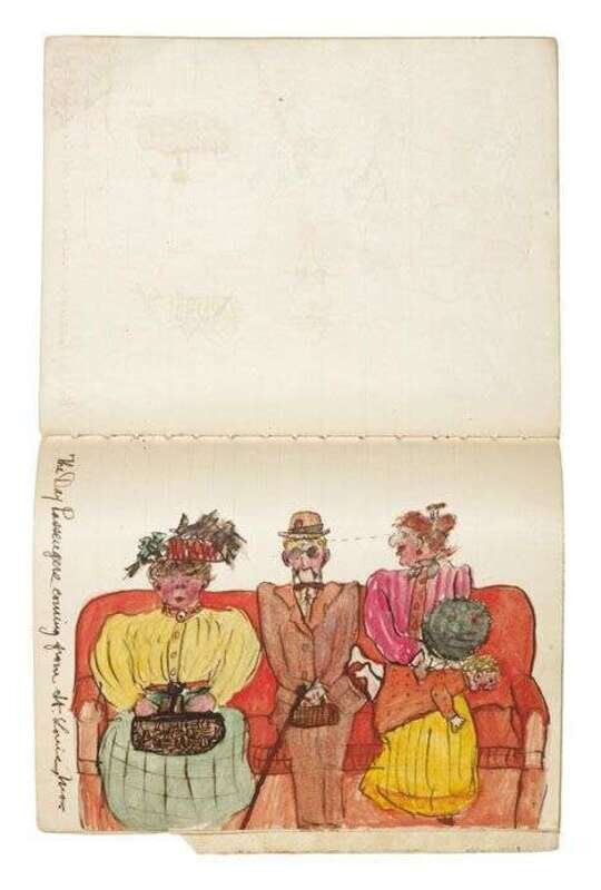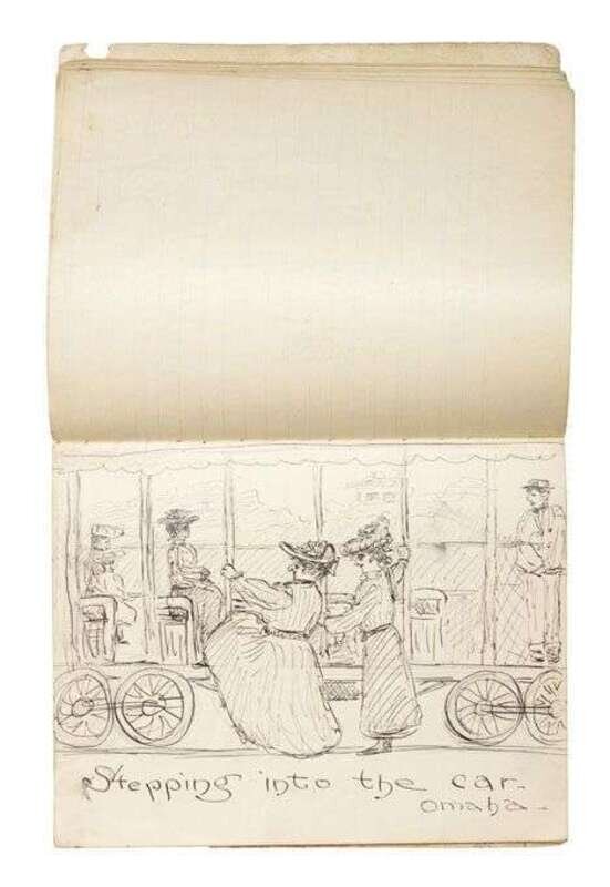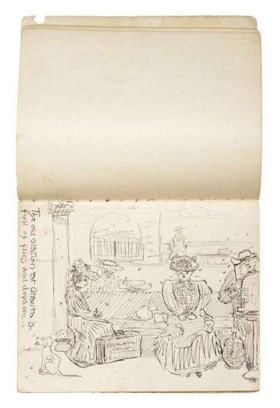 Depicting her family's journey from Omaha, Nebraska to Atlanta, Georgia via train; many drawings, including the interior of the Atlanta Railroad Station and a depiction of a suitcase marked for the architect 'T. Sully'; pencil, ink, and watercolor, on lined paper.