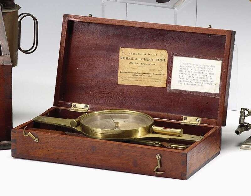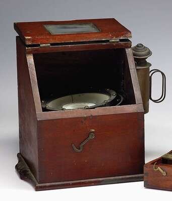 Circumferentor in mahogany box labeled 'Merrill & Davis No. 255 Front Street New York' together with gimballed wet card compass in wooden box with small side lantern, marked Oliver.