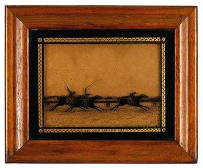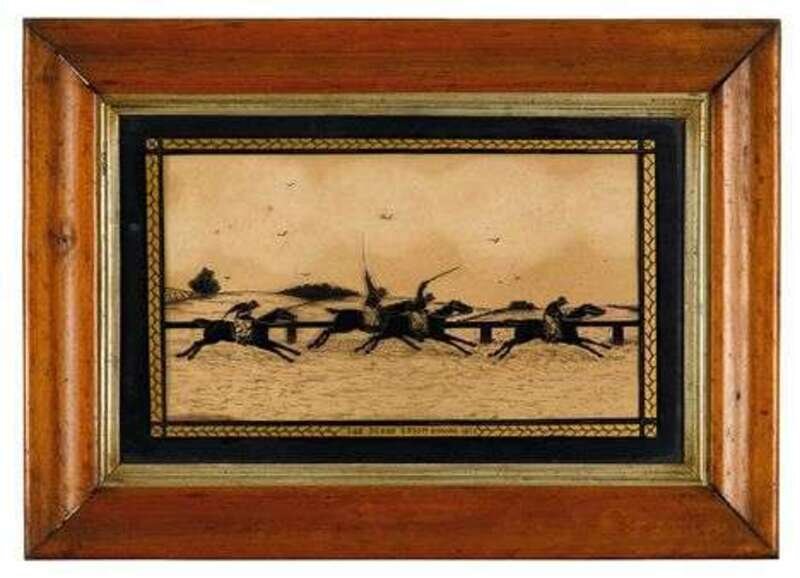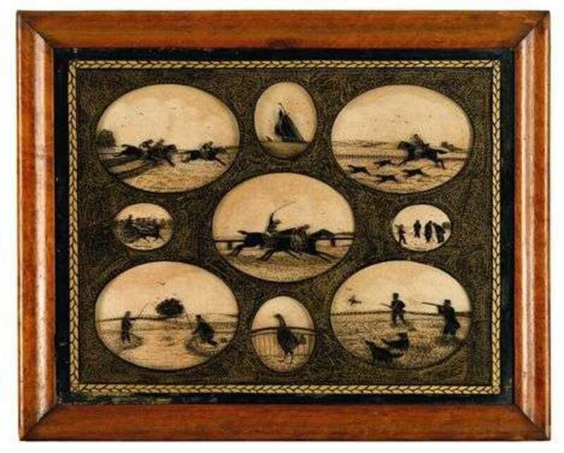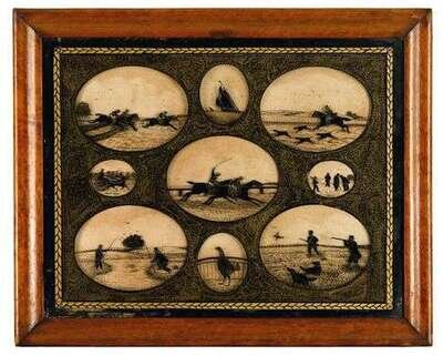 Including a pair with horse drawn carriages, a pair of sailing ships, two with racing scenes, and the last framed with nine sporting vignettes. (7).