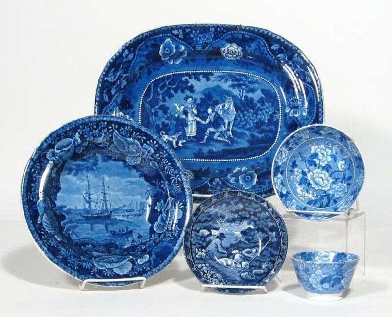 Group of five Staffordshire blue transfer-printed items 19th century