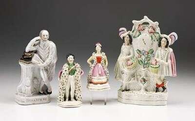 Including: figures of Shakespeare, Queen Victoria, Prince Albert, and one figural group with central flower in vase. (4).