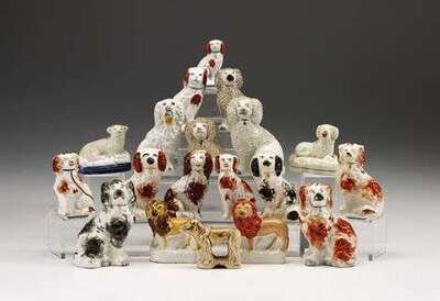Comprising fifteen seated spaniels, two standing lions, one recumbent lamb, and one standing dog. (19).