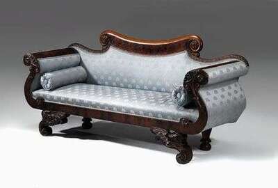 Scrolled back carved with foliage, rosettes and tassels over cornucopia and rosette carved arms on griffin carved legs ending in scrolled feet.