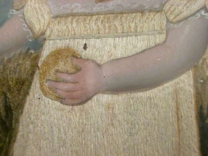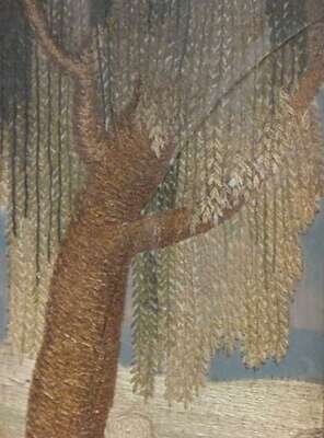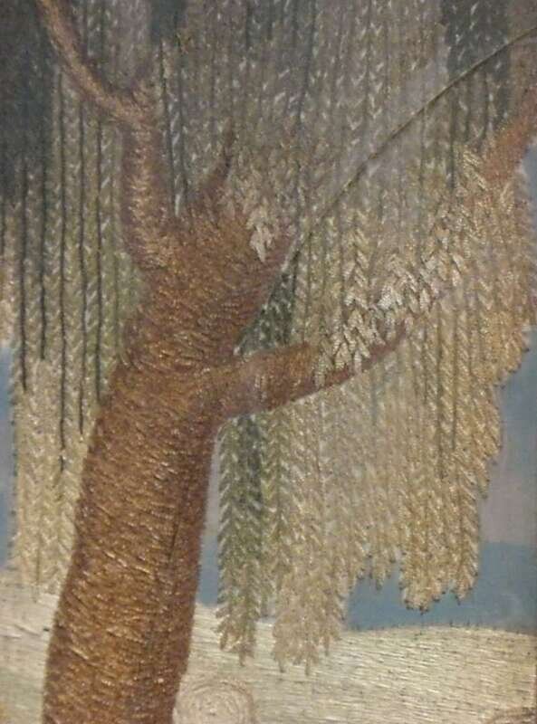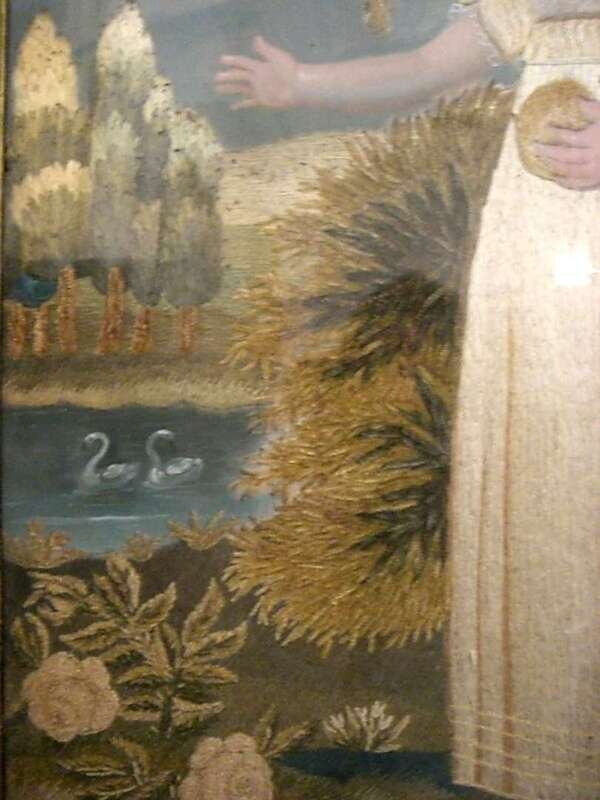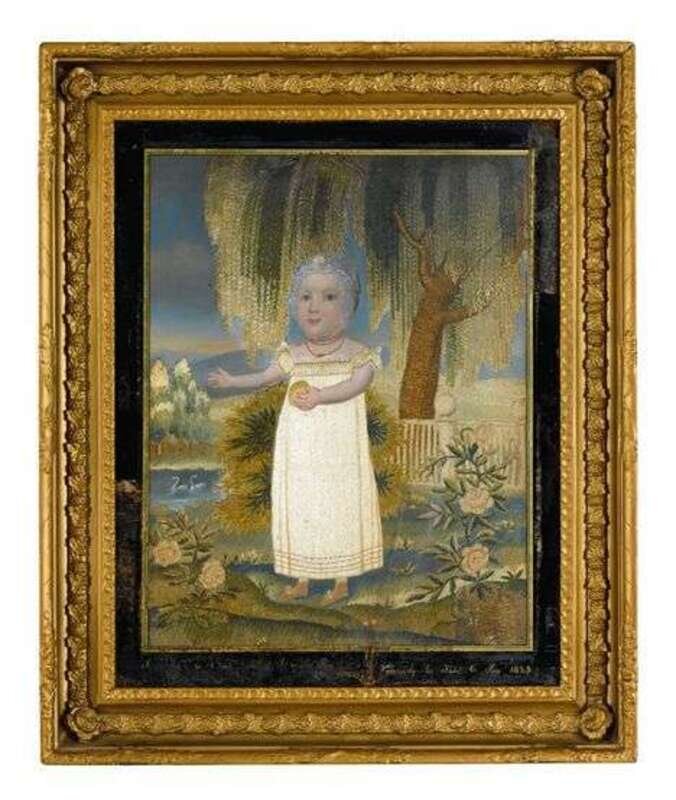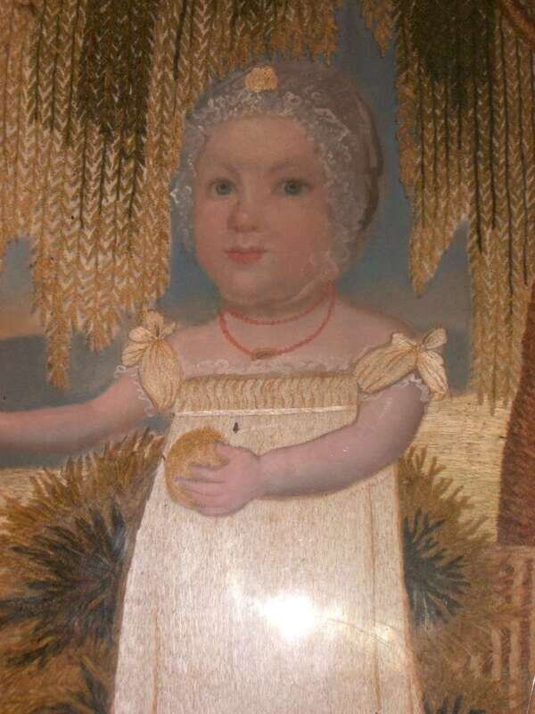 Depicting a young girl in white dress, bonnet and coral necklace holding a ball, the background with weeping willow and lake with swans, eglomise mat inscribed 'M.A. Pray in her 13th month daughter of J &C Pray Worked by her sister C. Pray, 1823', eglomise mat, in silk and chenille threads, heightened with watercolor on silk ground, gilt frame.
