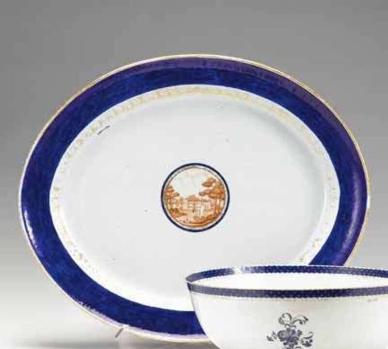 Of oval form, with blue rim and gilt edge enclosing a circular reserve depicting a riverscape with a boat and buildings in sepia, the base inscribed, 'Robert Gilmor of Baltimore - dinner service/Made to order - 1778-1885'.