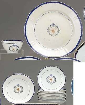 Comprising: A plate, a teabowl and ten saucers, decorated with blue enamel border enclosing blue ribbon and gilt floral spray. (12).