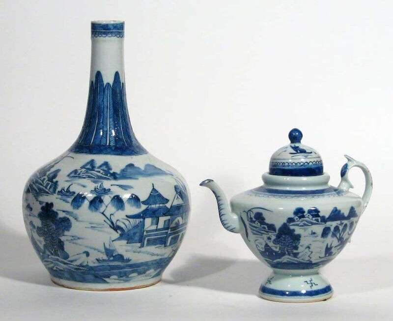 Vase with slender neck issuing from a rounded body, teapot with domed lid and tapered body on a round foot, both with typical decoration. (2).