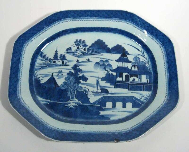 Of octagonal form, with diaperwork border centering a lakeside pavilion scene.