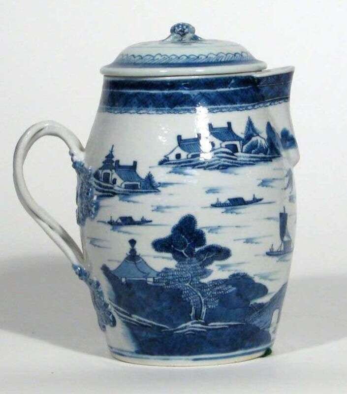 Of ovoid form, domed cover with berry knop, the body decorated with a river scene, with cross-strap handle.