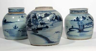 Three Chinese export porcelain blue and white Canton ginger jars 19th century