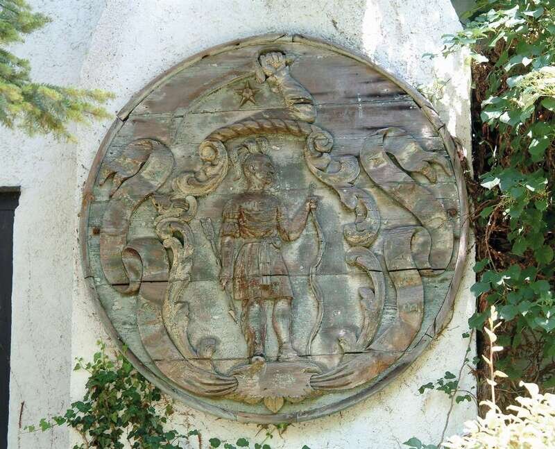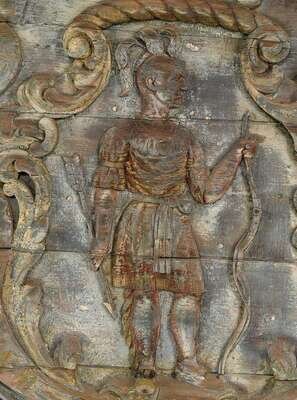 Carved with the figure of an Indian dressed in a shirt, leggings and moccasins, holding a bow in one hand and an arrow in the other, with the Latin motto 'Ense petit placidam sub libertate quietem,' (By the sword we seek peace but peace only under Liberty) inscribed in the bannerette.