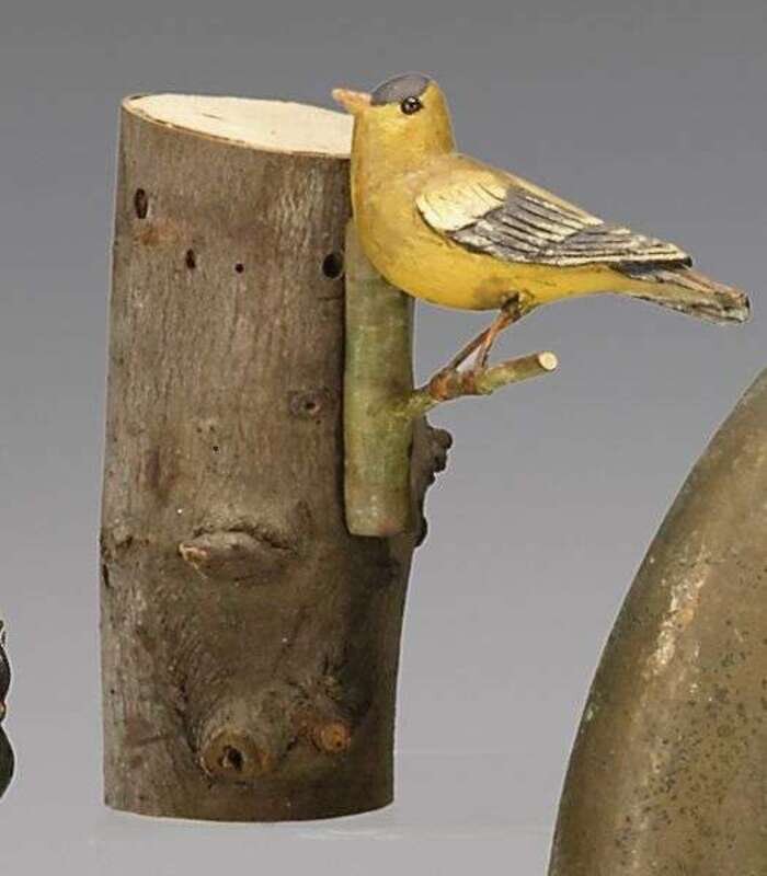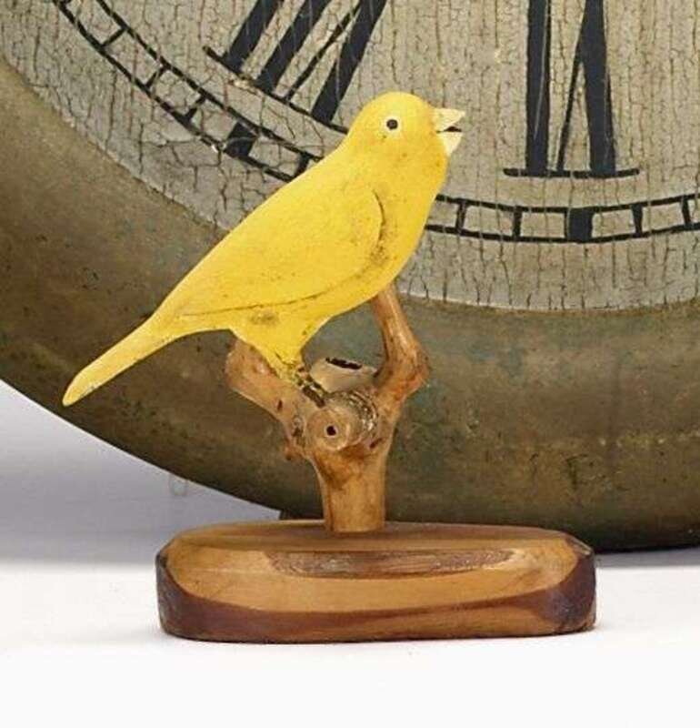 In the form of a canary on a perch and a goldfinch on a perch.