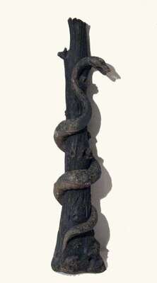 In the form of a green snake coiled around an stump.
