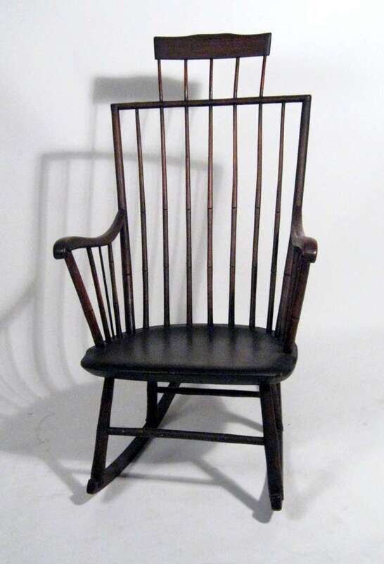 With seven spindle back surmounting carved arms and scoop planked seat above straight legs and stretchers raised on rockers.