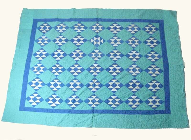 Bowtie pattern, with an aqua, blue and white pieced top and light green backing.