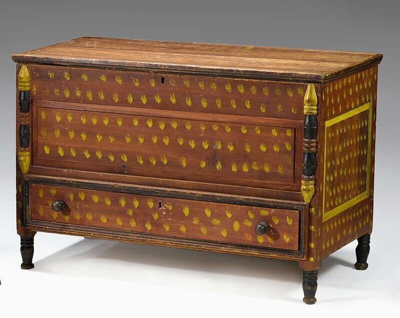 The molded and hinged rectangular top opening to a well with covered till, above one long drawer and supported on turned legs and ball feet; retains original red, yellow, and black paint and decorated with applied ring-and-vase turned spindles.