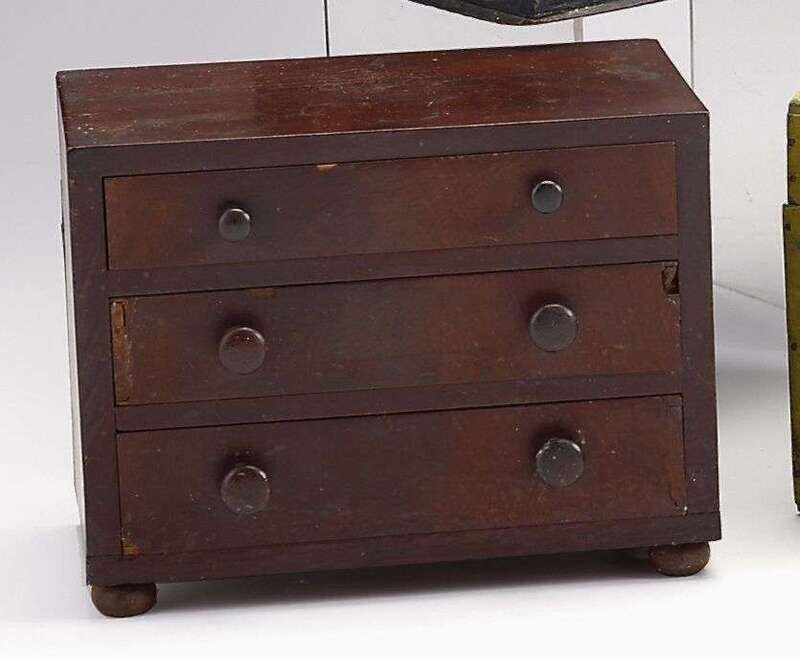 The rectangular top with conforming case fitted with three long drawers, resting on bun feet.
