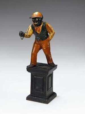 The figure depicted in typical garb, mounted on a pedestal base with recessed panels.