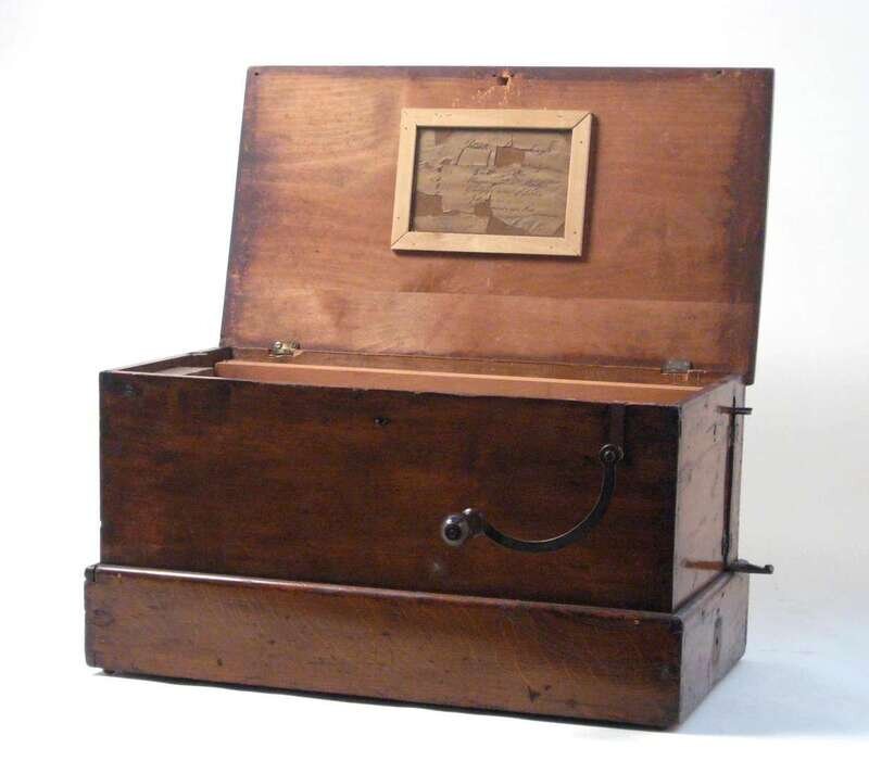 With rectangular case and molded base, with illegible paper label tune list on inside of lid.
