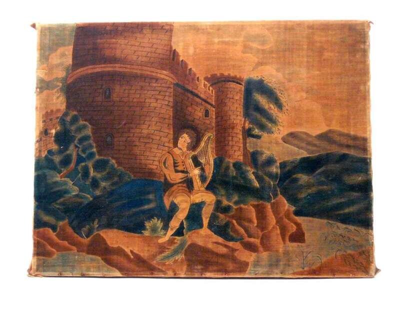 A romantic scene with castle and gentleman playing harp in foreground; unsigned, watercolor on velvet, unframed.