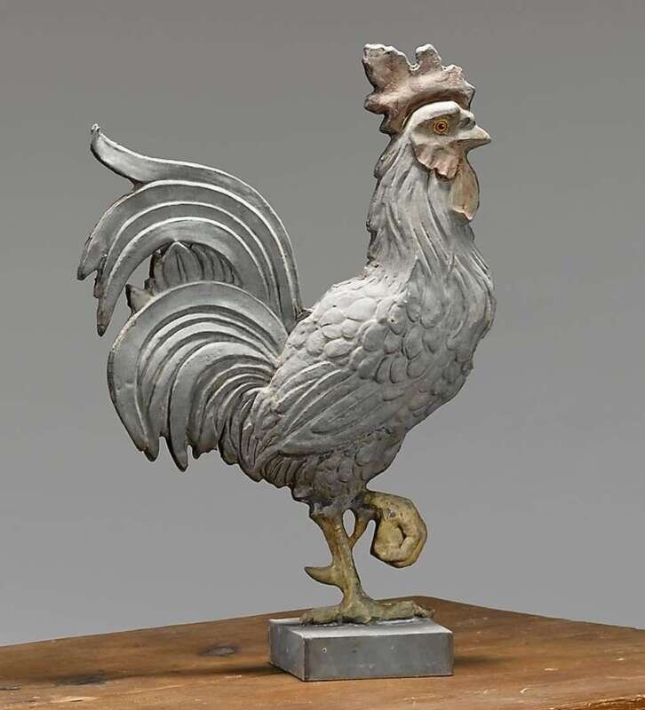 The full-bodied figure of a rooster standing on one leg, painted and with glass eyes.