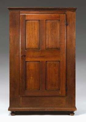 Crown molding surmounting a door with four raised panels opening to an upper shelf and two rows of hooks, resting on a molded base and bun feet; inscribed 'Zoar/ 1841' on inside of door.