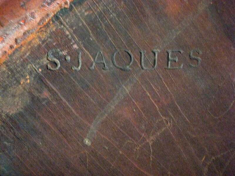 With bowed back over nine spindles; a molded cupped seat over bamboo turned legs and H-form stretchers, brand marked under seat 'S. Jaques'.