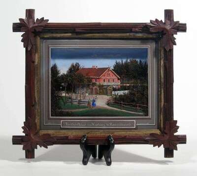 Painted German inscription along bottom 'Forster=Haus in der Wustung bei Habelschwerdt' and 'Gift von B. Geister N.Y.', mixed media, framed.