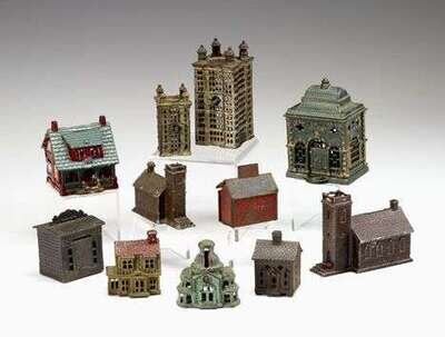 Comprising: five cast-iron bank buildings, one marked 'bank' and another marked '1876,' three cast-iron banks in the form of a house, one cast-iron bank of the 'Little Brown Church,' together with one metal paperweight of the 'Little Brown Church,' one miniature wooden church and one painted tin house. (11).