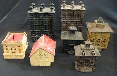 Group of cast-iron miniature coin bank buildings 19th century