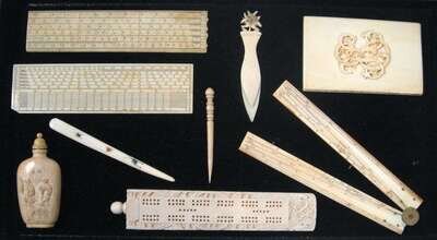 Comprising three rulers, an incised cribbage board, a small snuff bottle carved with figures, a card case cypher 'KE,' a bookmark, and two bodkins (9).