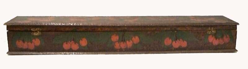 Hinged lid opens to reveal three compartments, overall pyrographic decoration of twigs, leaves, and cherries, bottom with pyrographic inscription 'Papa Xmas 1909'. Impressed maker's mark Flemish Art Co. and trade mark with two standing bears.