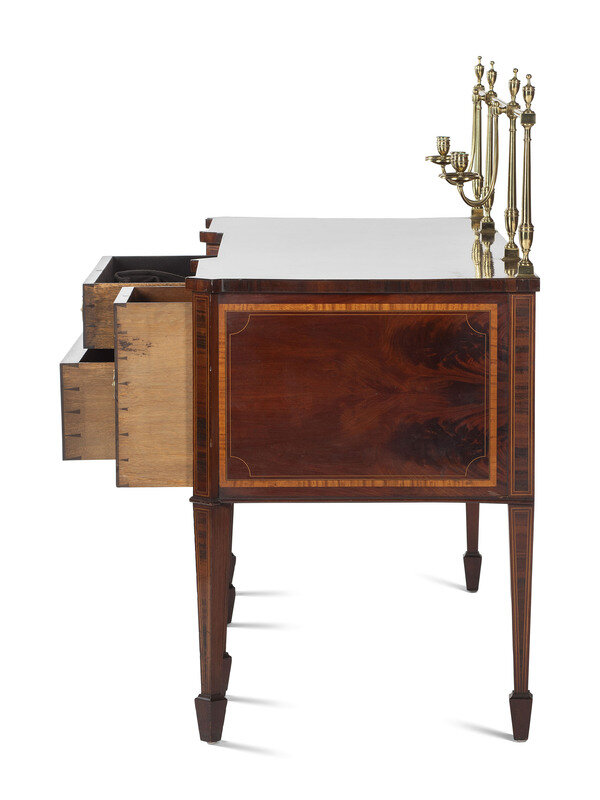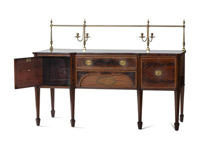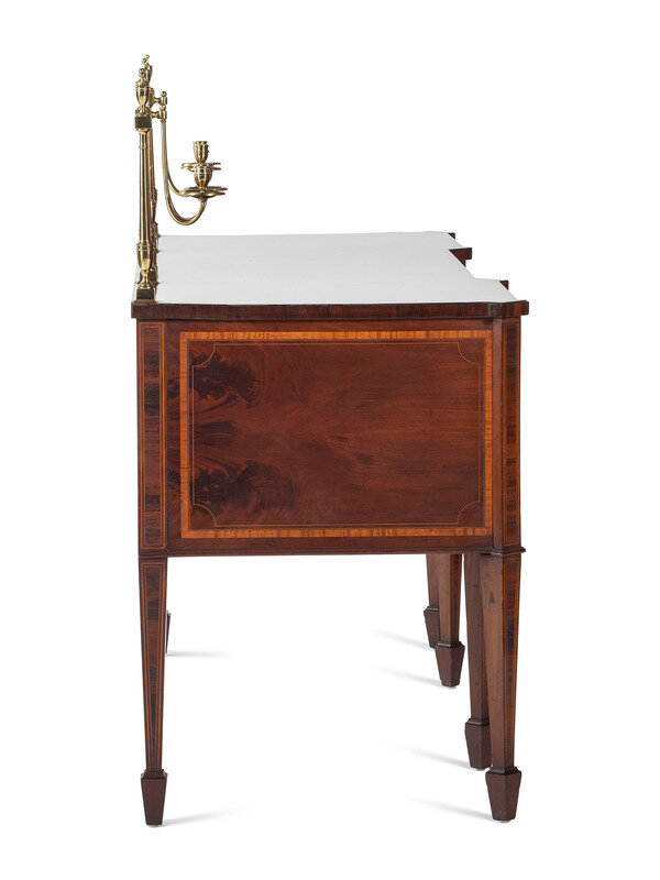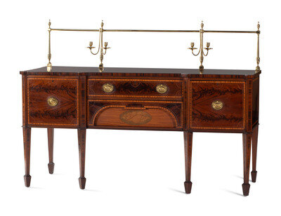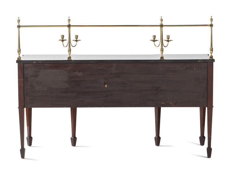 A George III Style Brass Mounted Mahogany and Marquetry Sideboard