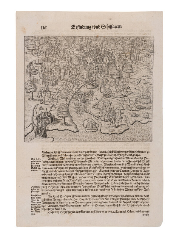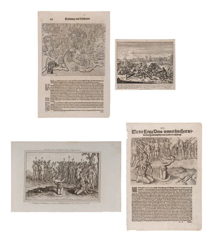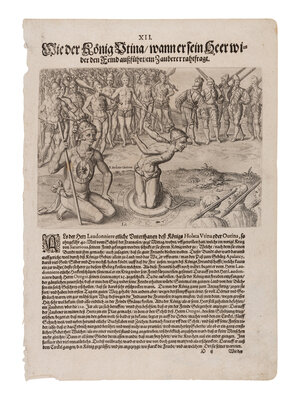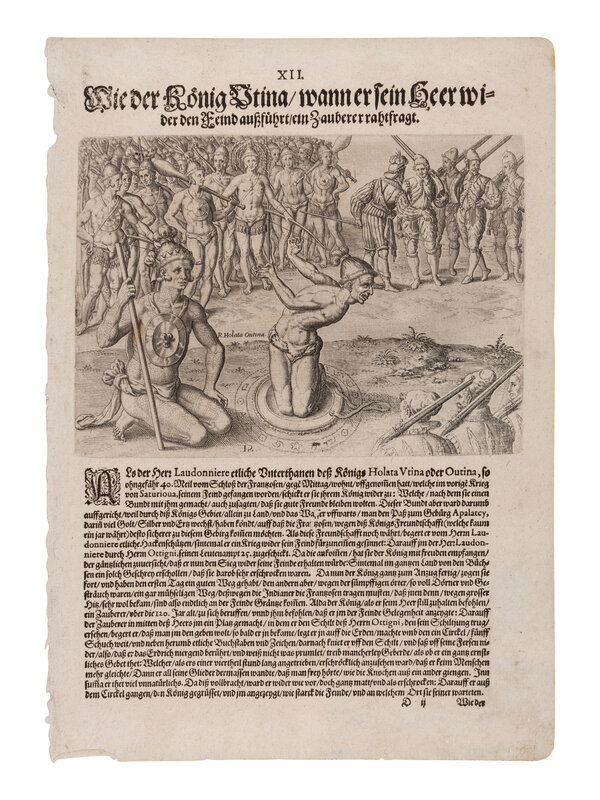 1-2) DE BRY, Theodor. Outina, going at the Head of His Army, Against the Enemy, Consults a Sorcerer on the Event, ca 1594 or later, from Frankfurt: Grand Voyages. -- And another leaf with an engraved illustration.
