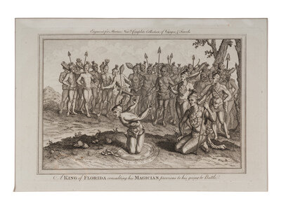 4) A King of Florida consulting his Magician previous to his going to Battle, n.d., from Moore's New Complete Collection of Voyages and Travel.